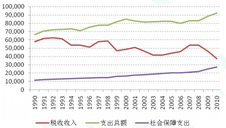 1990年之后,日本的房地产泡沫和股票市场泡沫崩溃,日本经济进入了“失去的二十年”。“日本第一”的雄心逐渐被消磨殆尽,二十年之后,日本变成了全世界债务第一。据IMF公布的数据,1990年日本的总债务占GDP的比例为68.04%,到2000年已经上升为142.06%,2010年更是攀升至220%。日本的债务规模之所以增长速度如此之快,主要是因为:第一,财政支出急剧扩大,导致政府不得不举债度日。为了刺激经济增长,日本政府采取了增加公共投资的扩张性财政政策,财政支出总额从1980年的约4万亿日元增加到2000年的约8.5万亿日元。在这段时期,日本的财政扩张政策还多次出现反复。当经济稍有起色,日本政府又急于回到财政平衡。好比一个疗程尚未结束,就匆忙停止服药,结果再次生病,治疗起来更加困难。第二,财政收入大幅度下降,使得日本政府入不敷出。这一方面是因为经济增长停滞导致税收收入减少,另一方面也是因为日本政府在20世纪90年代早期错误的推行了减税政策,以为这样可以刺激经济增长。日本税收于1992年达到最高,此后呈下滑趋势,至2000年税收收入只相当于最高时期的80%。到2010财年,日本的个人所得税收入只有1990财年的60%,公司所得税收入只有1990年的1/3。第三,随着债务的累积,利息支出越来越大,使得日本政府为了还旧债,就不得不发新债。1980年,日本所需偿还的利息总额约为4400亿日元,到2012年已经上升将近1万亿日元。按照著名经济学家罗高夫(Rogoff)的研究,债务余额占GDP的比例一旦超过90%的门槛,由于利息支出不断扩大,债务压力就会像滚雪球一样越来越大,债务规模很难再进行压缩。第四,随着日本人口的老龄化,社会保障支出不断增长。进入90年代后日本老龄化现象逐渐严重,65岁及以上的人口占总人口比例从1980年的9.1%快速上升至2005年的20.2%。日本政府在社会保障支出预算日益增加,1980年到2000年20年间翻了1倍有余,至17万亿日元。至2011年日本社会保障支出预算已经接近30万亿日元。