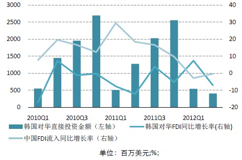 韩国对华直接投资增长率稳中有降。韩国对华直接投资同比增速长期低于中国吸引FDI的平均增速(2012年第1季度是一个例外)。2010年第1季度以来的10个季度(2012年第2季度只有4、5两月数据)中,只有3个季度韩国对华直接投资同比增长率为正,2012年4、5月合计同比增长率为-7.1%。这是由于金融危机以来,大宗商品价格波动剧烈,韩国对外投资的重点转向矿业领域,该领域对外直接投资在2011年激增99.9%。由于中国矿产领域并未对外资开放,并且国际市场认为中国经济增长前景仍然面临不确定性,因此韩国对华投资将可能继续稳中有降。