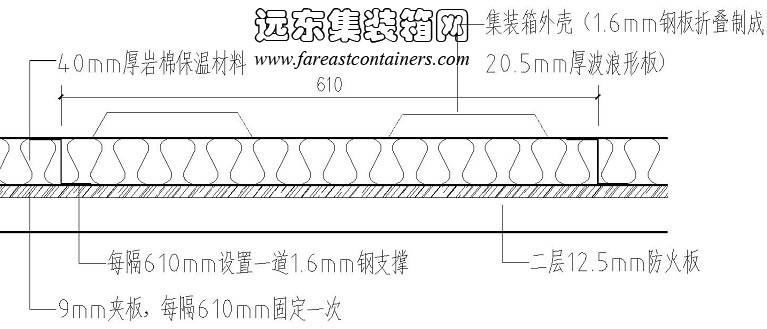 集装箱箱体顶棚一般使用龙骨吊挂饰面板材,在饰面板上部填充保温材料,上部灯具使用集成吊顶埋藏在顶棚表面内或者固定在饰面板下。图 6.3 中所示顶棚保温做法中,使用槽钢作为龙骨,每隔400毫米设置一道。在龙骨下部固定有9毫米厚胶合板,胶合板与顶棚之间为100毫米厚岩棉保温材料。