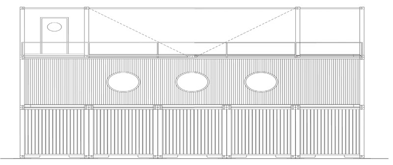 两个叠起的集装箱依附于房子的南侧。底层集装箱(ISO 40英尺)是顶层集装箱(ISO 20英尺)的二倍大。标准集装箱的宽度几乎不能满足正常的生活空间,因此一个中间缓冲区插入既有建筑和扩建的集装箱之间。设置了绝缘层和混凝土楼板的木框架,沿着扩建部分的整个长度增加了一米宽的空间。这片缓冲区扩大了室内的中央空间,而这恰恰曾是现有房子里最拥挤的部分。